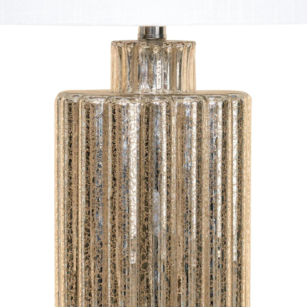 The Allure Table Lamp is a timeless piece that adds elegance to any space. Featuring a stunning mercury glass base with subtle patterning, it offers a sophisticated metallic tonal mix that complements any color palette. The lamp is topped with a white linen drum shade, and stands at an impressive 76cm in height, making it a striking statement on its own or as a pair. The ribbed glass base creates a mesmerizing glow, enhancing the ambiance of any room with its refined beauty. Perfect for creating a touch of luxury in your home.