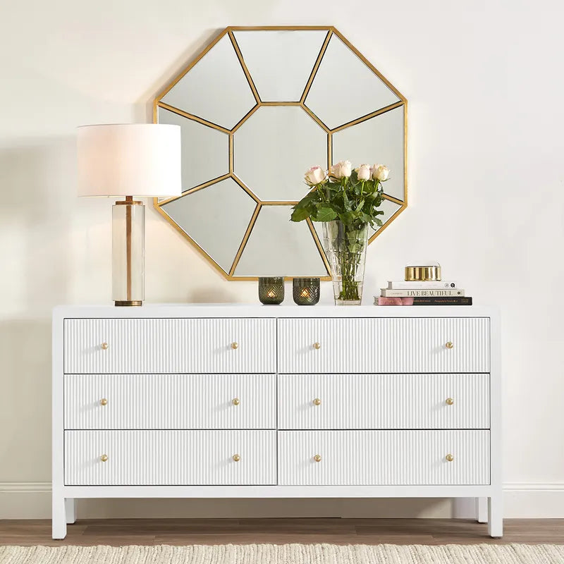 Enveloping your space with an airy feel, our Ariana 6 drawer chest is all about the details from the fluted drawer fronts to brushed gold handles. Accentuating your bedroom or living room space with its fresh colour and textural finish, scaled for both maximum storage and design presence. The Ariana chest of drawers is the epitome of function and beauty that will instantly elevate your colour scheme and design.