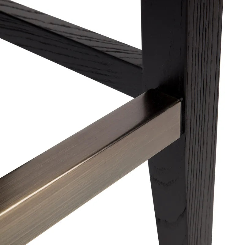 This luxury bar stool stands tall at 76cm on an elegantly tapered solid birch frame in a rich black painted finish. Refined details like the brushed bronze studs and brass finished footrest add subtle glamour while the pure linen upholstered seat in a gorgeous natural texture with tufted detailing adds classic charm. For added comfort, the Canyon black bar stool features a high-density, foam-filled cushioned seat bringing form, function and elegance to your bar or kitchen zone.