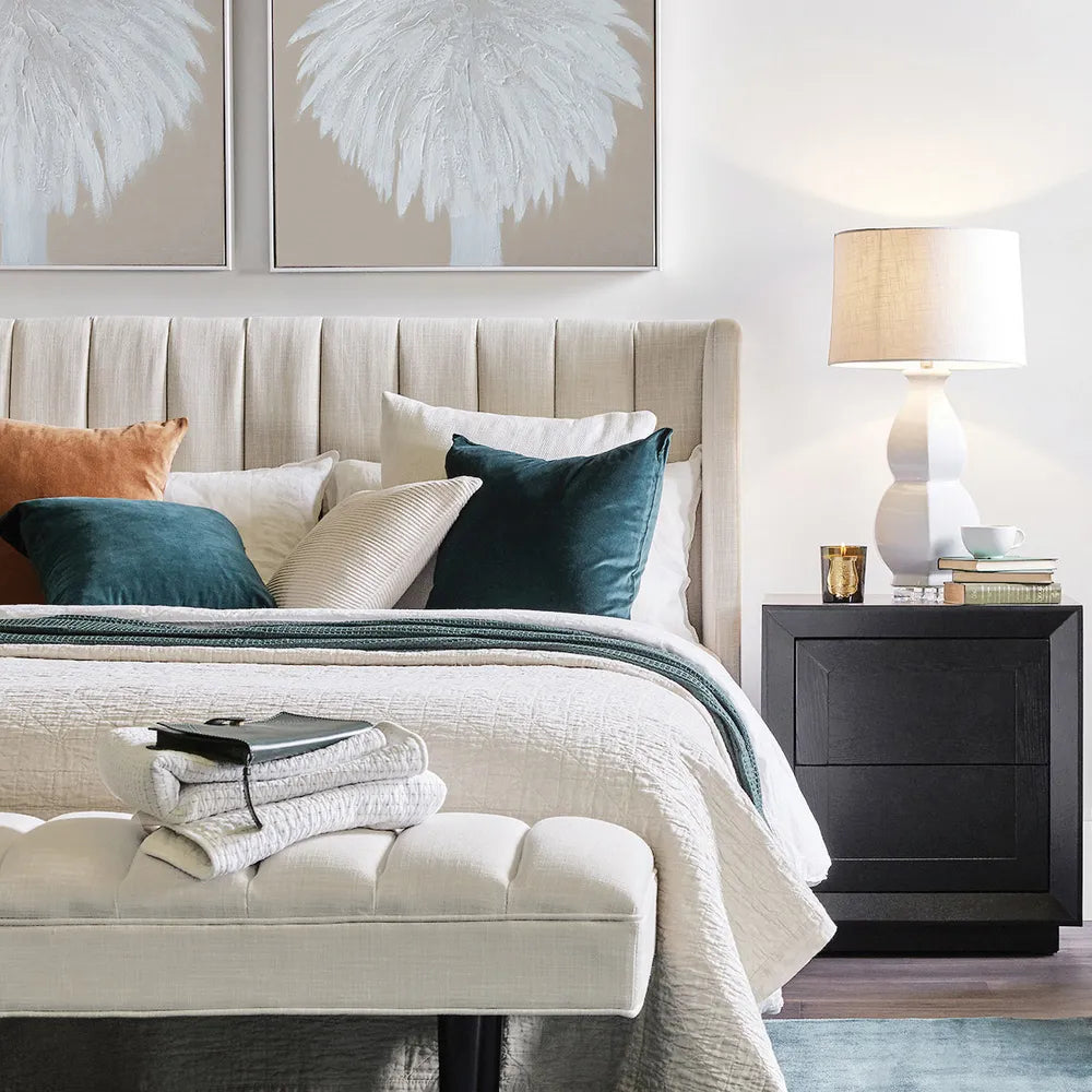 A classic bedhead, the Central Park Winged Bedhead features a wing back with detailed panelled upholstery in a natural linen blend fabric or a wine velvet for a bold statement. Classic contemporary in design, the Central Park Winged King Bedhead is the perfect accent piece for an elegantly styled bedroom. Complete the look by adding the Central Park Panelled Ottoman for a truly chic designer bedroom interior.