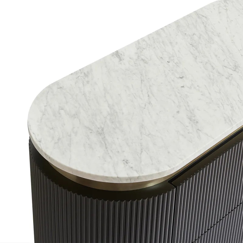 An embodiment of modern craftsmanship, the Demarco chest of drawers in white exudes sophisticated allure. Showcasing a ribbed texture and sleek brass accents, this stunning piece is crowned with a gracefully curved white Carrara marble top. Its three spacious drawers offer ample storage, blending functionality with aesthetic elegance. Supported by streamlined brass legs, the Demarco chest of drawers brings timeless style and effortless glamour to any bedroom or living space, creating an elevated and refined atmosphere.