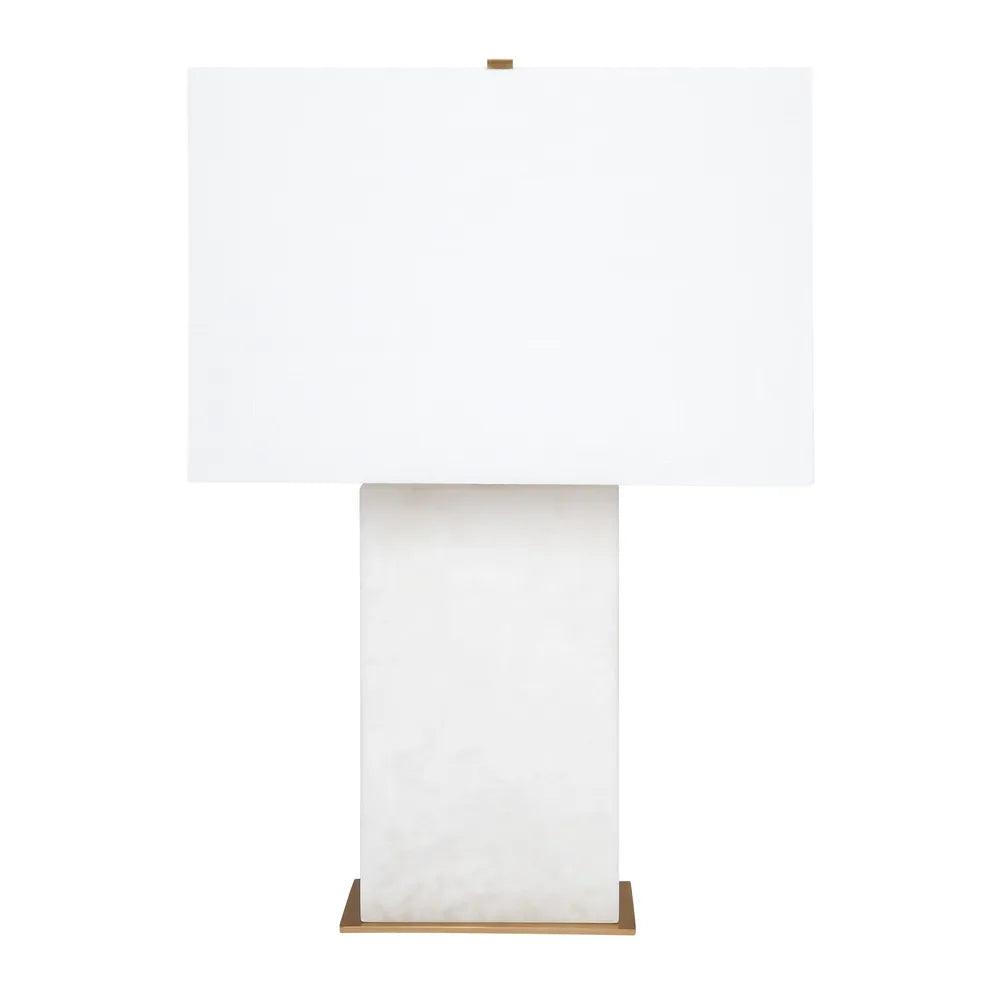 Add a touch of elegance to your space with the Dominique Table Lamp. This stunning lamp features a striking slab of natural alabaster or travertine stone set on a sleek brass base, complemented by a rectangular linen shade and matching brass finial. The clean, sharp lines and classic column silhouette make it a functional yet stylish showpiece. The use of organic materials adds sophistication and warmth, while the slubbed white linen shade creates a soft, dreamy ambiance. Perfect for enhancing any room with a blend of timeless design and natural beauty.