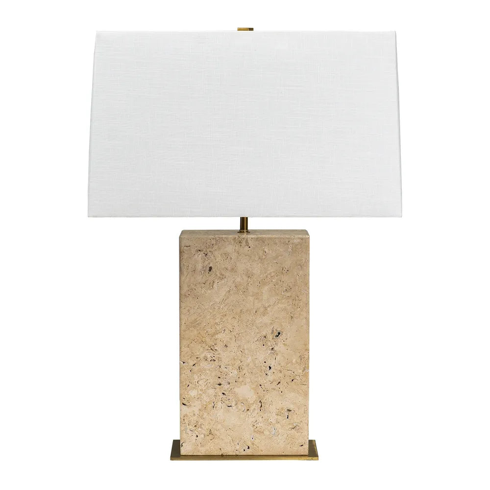 Add a touch of elegance to your space with the Dominique Table Lamp. This stunning lamp features a striking slab of natural alabaster or travertine stone set on a sleek brass base, complemented by a rectangular linen shade and matching brass finial. The clean, sharp lines and classic column silhouette make it a functional yet stylish showpiece. The use of organic materials adds sophistication and warmth, while the slubbed white linen shade creates a soft, dreamy ambiance. Perfect for enhancing any room with a blend of timeless design and natural beauty.