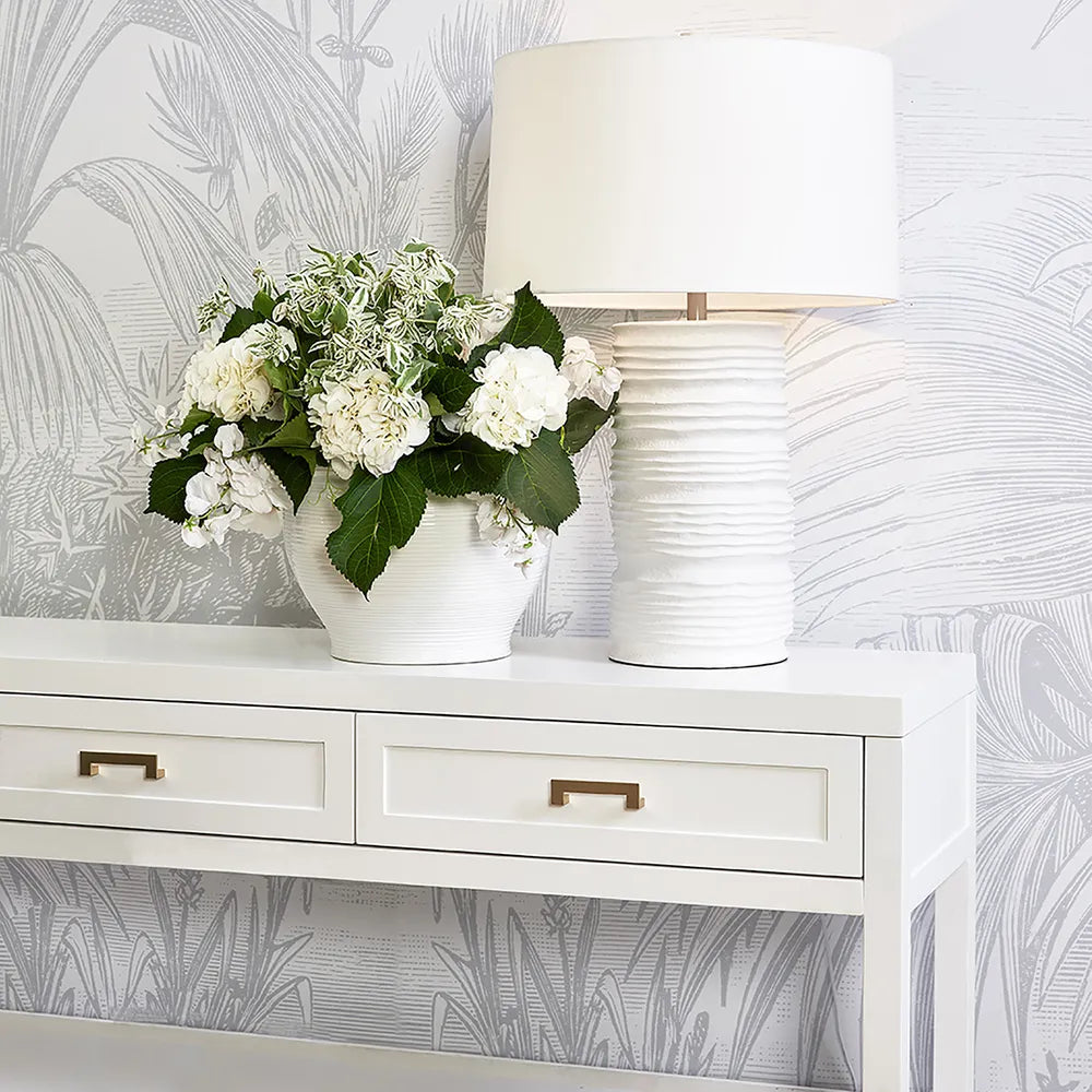 Sculptural Design Inspired by Nature Elevate your space with the Matisse Table Lamp, a stunning blend of organic design and artistic craftsmanship. Featuring a beautifully ridged surface, this handcrafted lamp brings a sculptural, nature-inspired quality to any room. Finished in a soft, chalky matte white, it seamlessly complements a variety of interior styles, adding gentle texture and contrast to sharper surfaces. When illuminated, the off-white linen drum shade casts a warm, inviting glow, accentuating the lamp's undulating lines and earthy charm. The elegant harp and finial fitting, crafted with matching ribbed details, complete this piece, adding a touch of raw, natural beauty to your home decor. Perfect for adding texture, form, and warmth to your space, the Matisse Table Lamp is an ideal addition to any room in need of effortless elegance.