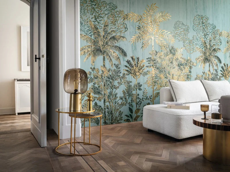 In the middle of the desert, an oasis of indescribable beauty. On a metallic base, the palm grove stretches as far as the eye can see. The vegetal silhouettes emerge in an intensity of colours rendered by digital printing. Infinitely repeatable, the wall panel Siwa transports your interior to the heart of an oasis and invites you to escape. Supplied 4 drops of 2.8m. NOTE: One panel can be matched to the next. Available in 3 colours.